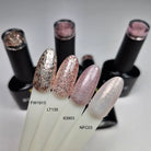 Bluesky gel lak FW1913 - rose gold (zlato roza) odtenek z različno velikimi belščicami. Nanesen v dveh slojih, prekrije cca. 75% naravnega nohta. Odličen tudi kot tanek nanos čez klasične odtenke, za popestritev manikire.