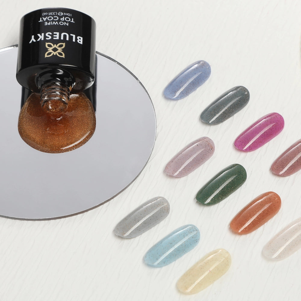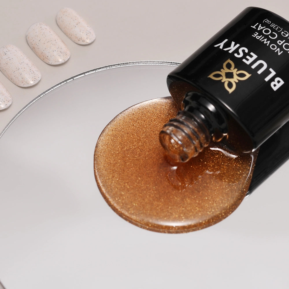 Bluesky No wipe SANDY prozorni top coat s črnimi in zlatimi pikicami. Na voljo kot no wipe Top coat. Nohtov po sušenju ni potrebno brisati (na nohtih ne ostane mastna disperzijska plast).