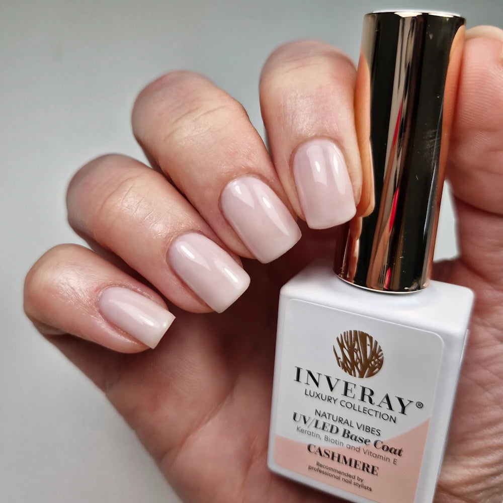 Inveray barvni base coat iz linije Natural Vibes - odtenek CASHMERE, čudovit nežen mlečni-naravno roza odtenek. Nanesen v eni plasti je odtenek prosojen, nanesen v dveh plasteh je prekriven.