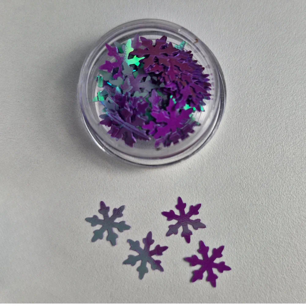 Tanka dekoracija za nohte v obliki snežinke. Snežinka je vijola barve, premer 8mm.