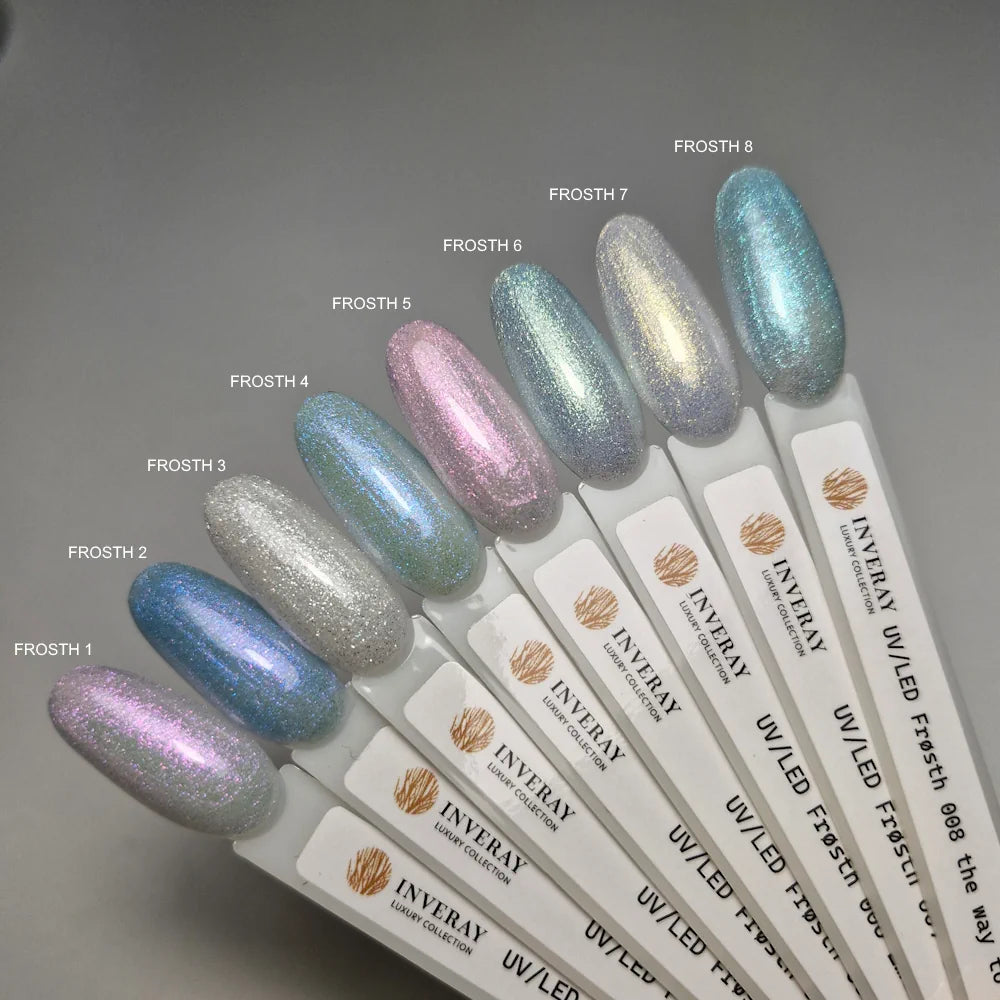 Inveray Frosth 001 - prozoren odtenek s čudovitimi roza in vijola drobnimi bleščicami. Nanesen čez klasične gel lake doda nohtom nov sijaj v nekaj minutah! Kolekcija 8 bleščečih odtenkov FRØSTH omogoča, da vsako manikiro spremenite v čisto unikatno kreacijo: