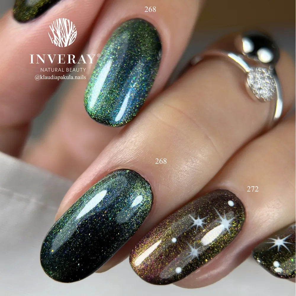 Inveray gel lak 268 - MAGNETNI (cat eye) odtenek. Če svežemu odtenku približate magnet, lahko z njim na nohtu ustvarite različne vzorce. Magnetni odtenki imajo najbolj močan efekt, če so naneseni na črno podlago, lahko pa jih uporabite na katerikoli barvni podlagi.