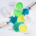 Linija gel lakov INVERAY Macaron so delno prosojni gel laki z bleščicami različnih oblik in velikosti. Gel lak je zapakiran v posodico zaradi enostavnejšega zajemanja bleščic iz posodice na nohtno ploščo. Macaron gel lak z bleščicami zajamemlo s čopičem za gel, nato lahko s tankim čopičem enostavno razporedimo bleščice po nohtu. Nanšanje je enostavnejše, saj se zaradi napredne formule bleščice med seboj ne lepijo.