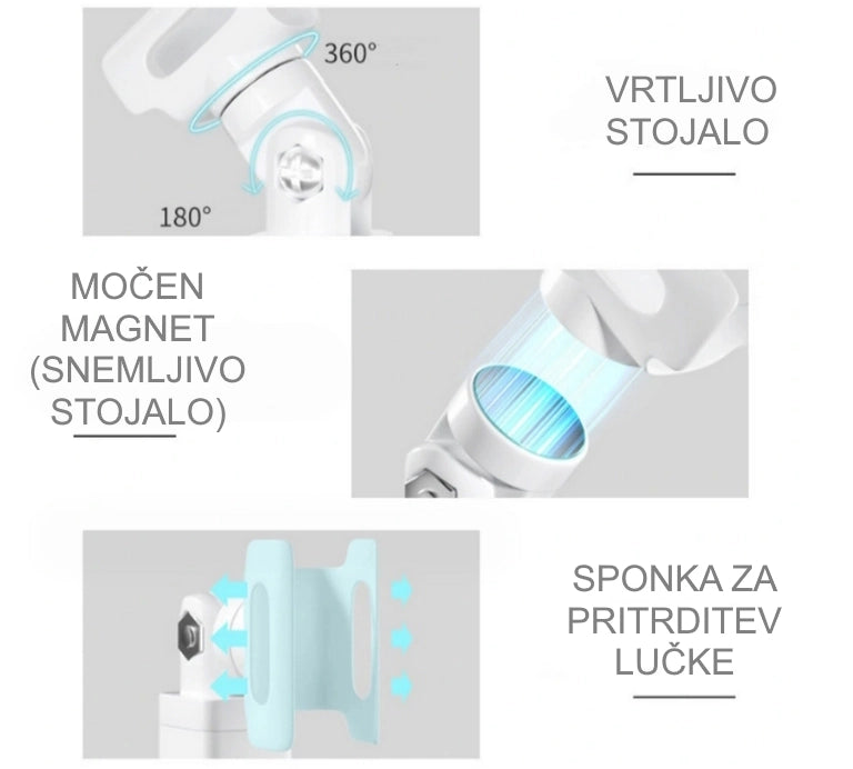 Snemljivo lučko pritrdite na sponko/stojalo, kot je prikazano na sliki. Sponka je na stojalo pritrjena z magnetom, zato jo lahko enostavno snamete in nazaj pritrdite na stojalo.