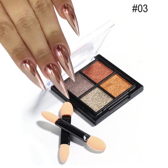 Polvere magica per la decorazione delle unghie. Il contenitore contiene 4 polveri diverse. Oltre alle polveri, riceverai anche 2 spugnette per applicarle.