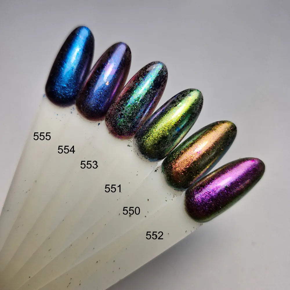 Aurora Cameleon puder s katerim lahko ustvarite čudoviti večbarvni, prelivajoč se sijaj na nohtih. Puder se nanaša s priloženo gobico. Za popoln oprijem bleščic po celotni površini nohta pa priporočamo nanos na »mastno« disperzijsko plast.