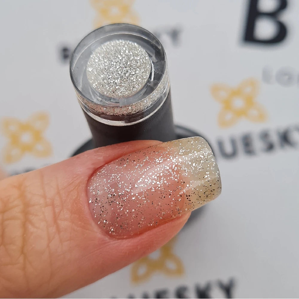 Smalto gel Bluesky QXG43: tonalità trasparente con fini glitter argentati.