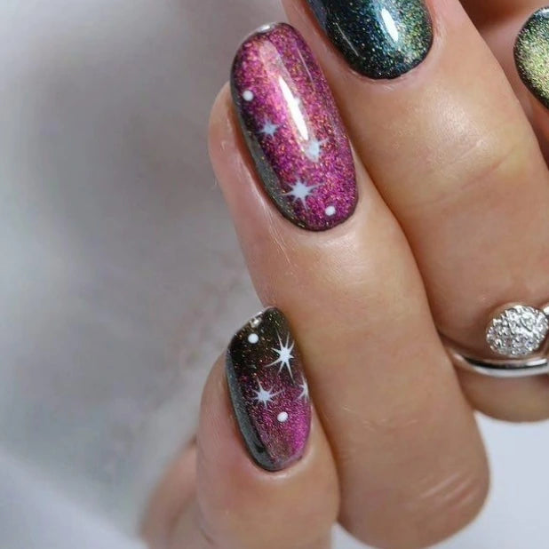 Inveray gel lak 272 - MAGNETNI (cat eye) odtenek. Če svežemu odtenku približate magnet, lahko z njim na nohtu ustvarite različne vzorce. Magnetni odtenki imajo najbolj močan efekt, če so naneseni na črno podlago, lahko pa jih uporabite na katerikoli barvni podlagi.