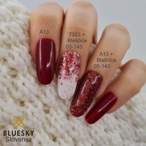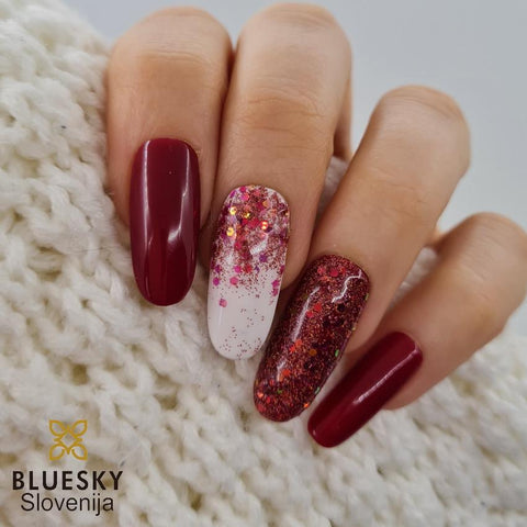 Uporaba 2: Bleščice gosto zmešate z gelom /gel lakom, ter mešanico nanesete na noht, posušite pod lučko, nato nanesete še nadlak.