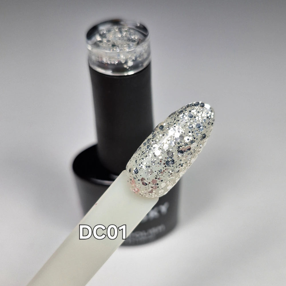 Bluesky gel lak DC01 - Prozoren gel lak z manjšimi in večjimi srebrnimi bleščicami.