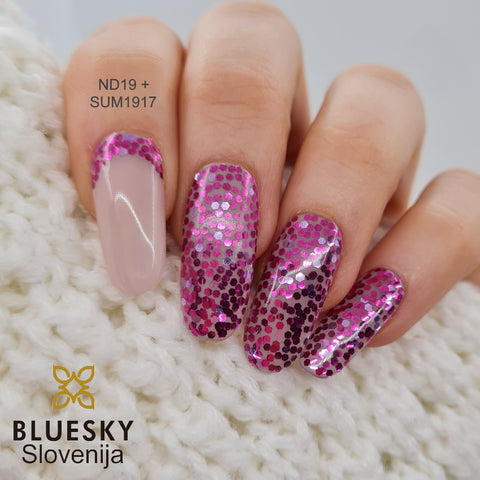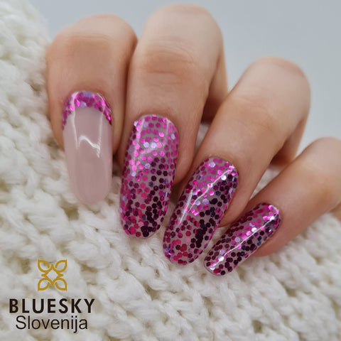 Bluesky gel lak SUM1917 - prozoren gel lak z vijola bleščicami. Če bleščice lepo razporedite, lahko ustvarite na nohtih različne vzorce. Odličen tudi kot tanek nanos čez klasične odtenke, kot popestritev manikire.